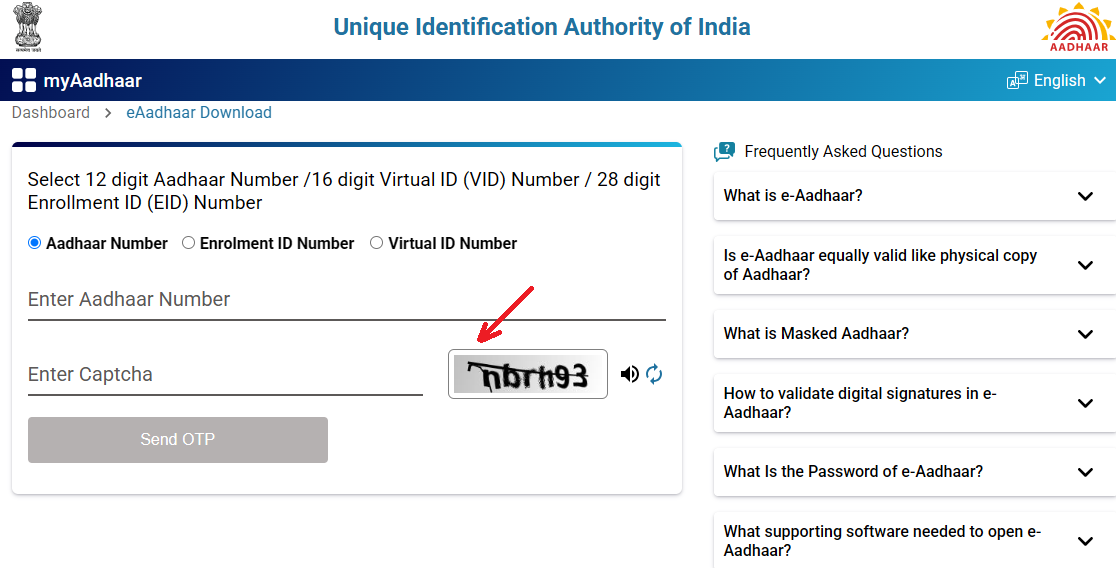 - Enter your Aadhaar number, VID, or EID, and complete the captcha.